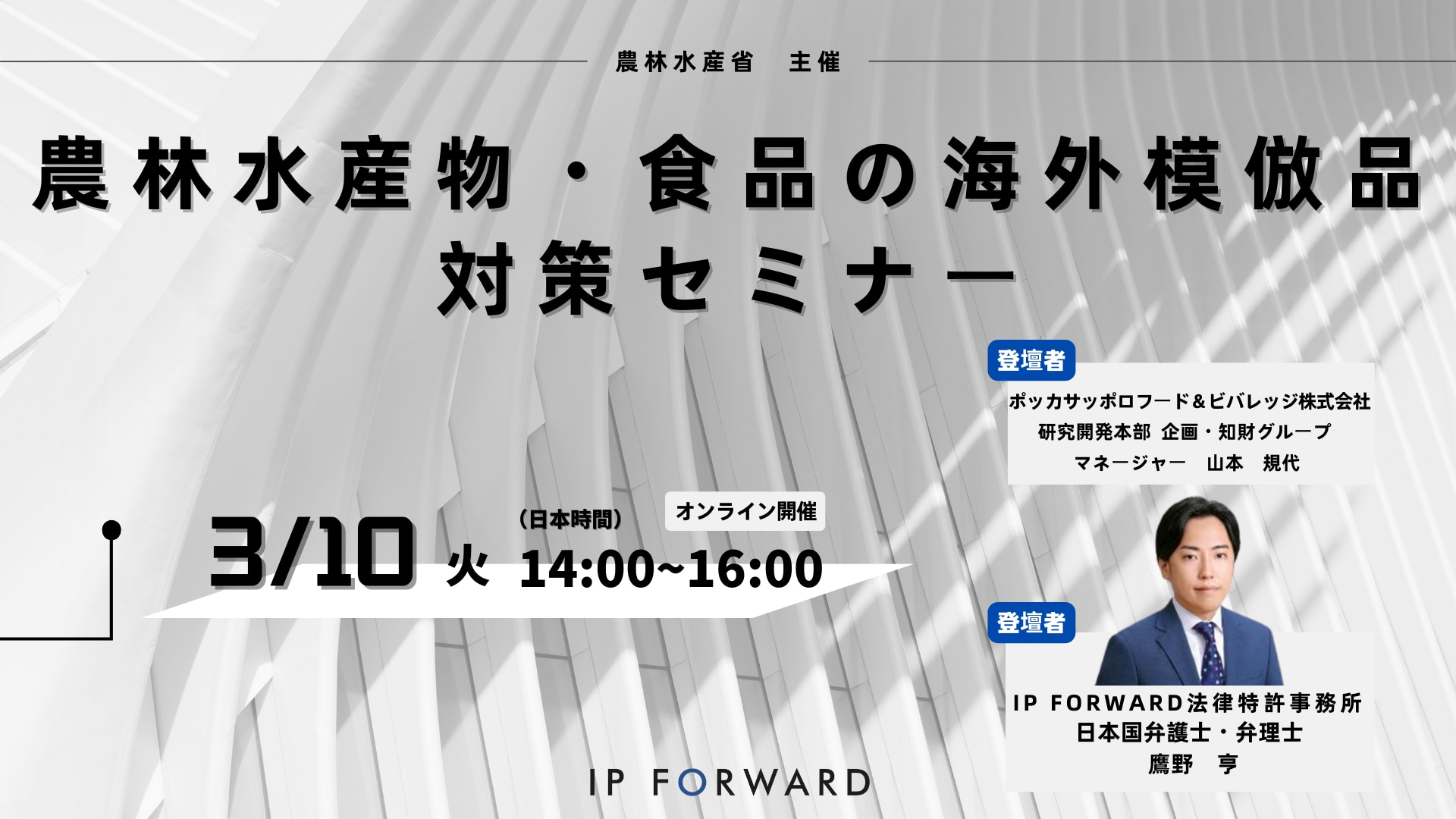 本セミナーでは、ポッカサッポロフード&ビバレッジ株式会社の⼭本様にご登壇いただき、飲⾷品における模倣品対策などの取り組み事例についてご講演をいただくとともに、最新の模倣品の被害状況や実際の相談事例を基に被害を受けた際の対策を分かりやすく解説しますので、ぜひご参加ください。